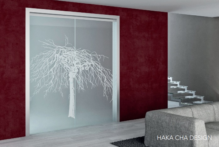 SANDBLASTING ONTO TRANSPARENT OR SATIN GLASS: During sandblasting the door is covered with a mask except for the areas which require the design. The areas that are exposed to the sandblasting become more opaque than the satin base. The door is then given an anti-marking treatment.