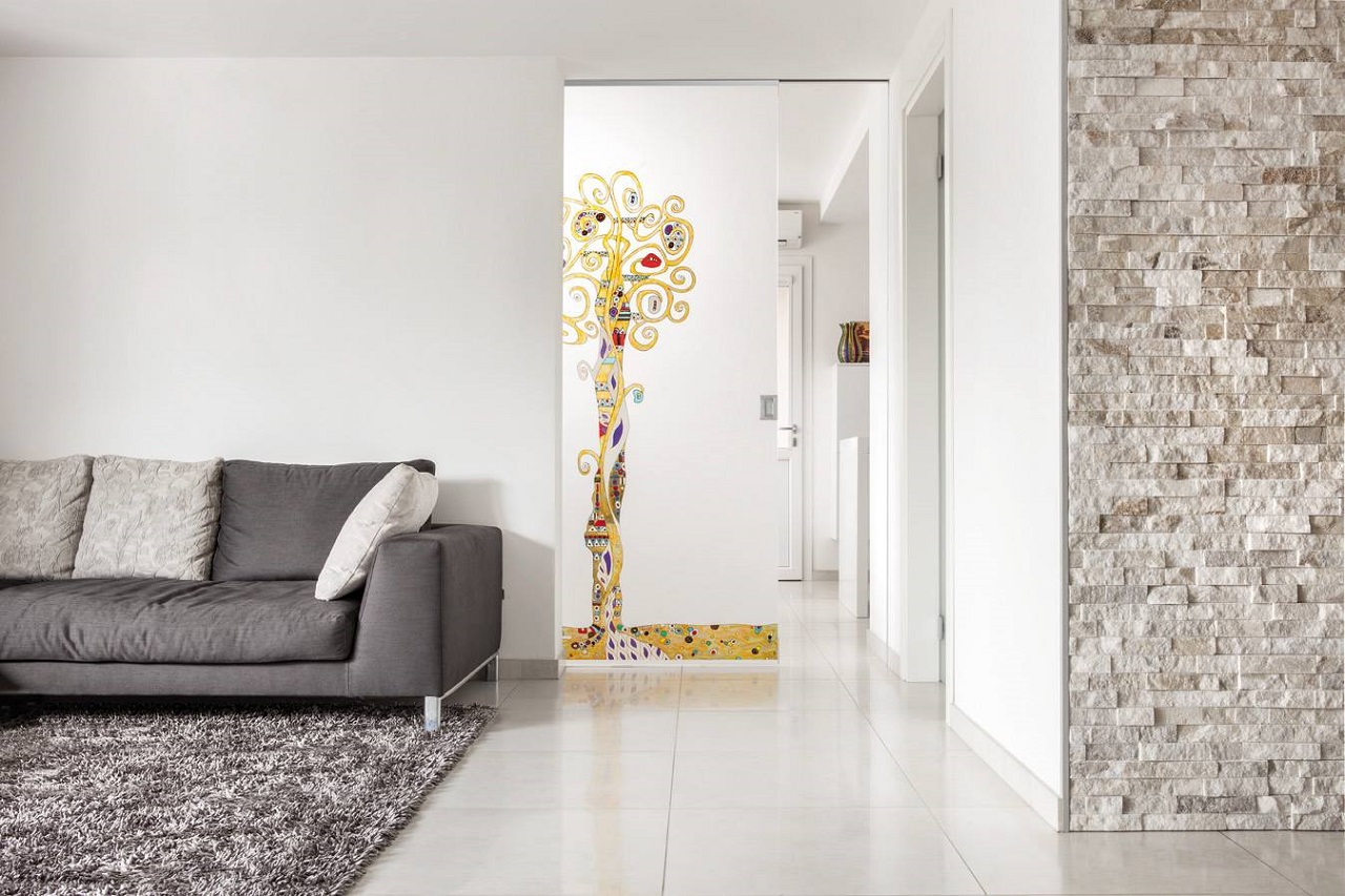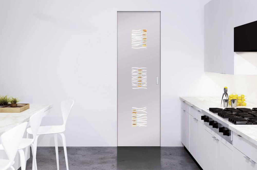 Every hand painted glass panel is a unique piece created entirely by hand involving many days of work by KARIS artisans. The combination of the stunning hand painted glass panel and the high quality ECLISSE pocket door frame results in a door that is both functional, and also a unique, hand-crafted piece of art.