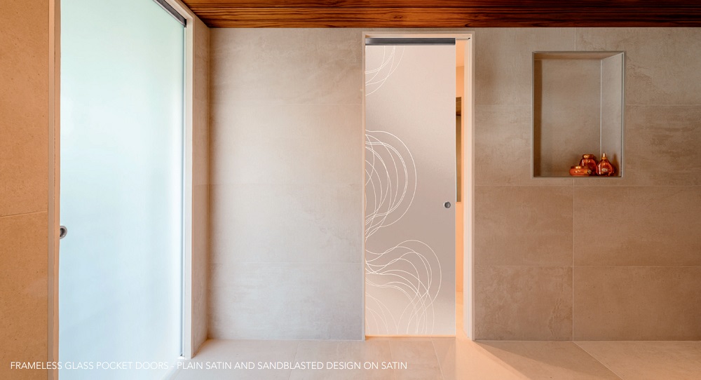 SATIN GLASS: Satin coloured glass doors have a light film of colour sprayed onto transparent glass to give it a translucent coloured glass fnish. One side is smooth, the reverse is matt. Satin coloured glass doors let light shine through.