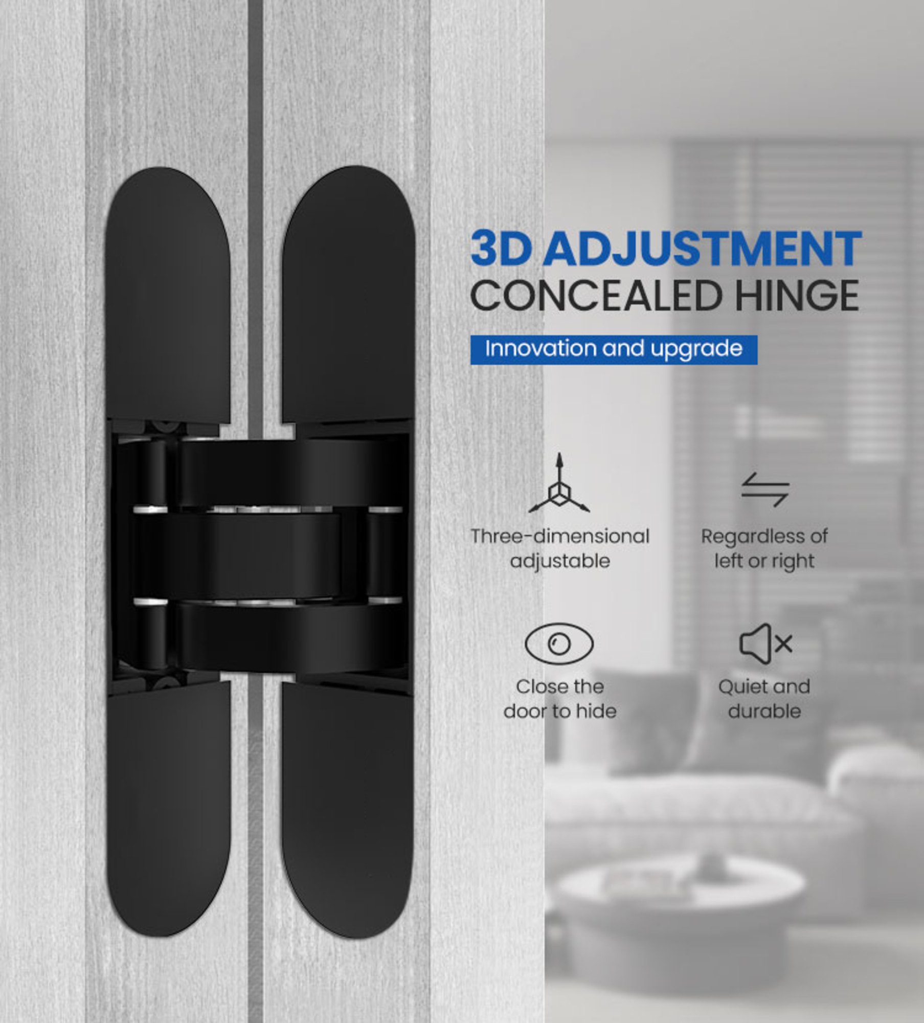 Concealed door hinges create a modern look. They do not stand out and do not distract from the aesthetic of their surroundings. Modern homeowners often decide on hidden door hinges for this specific reason. The adjustable door hinge Villar Home Design offers is just that!
